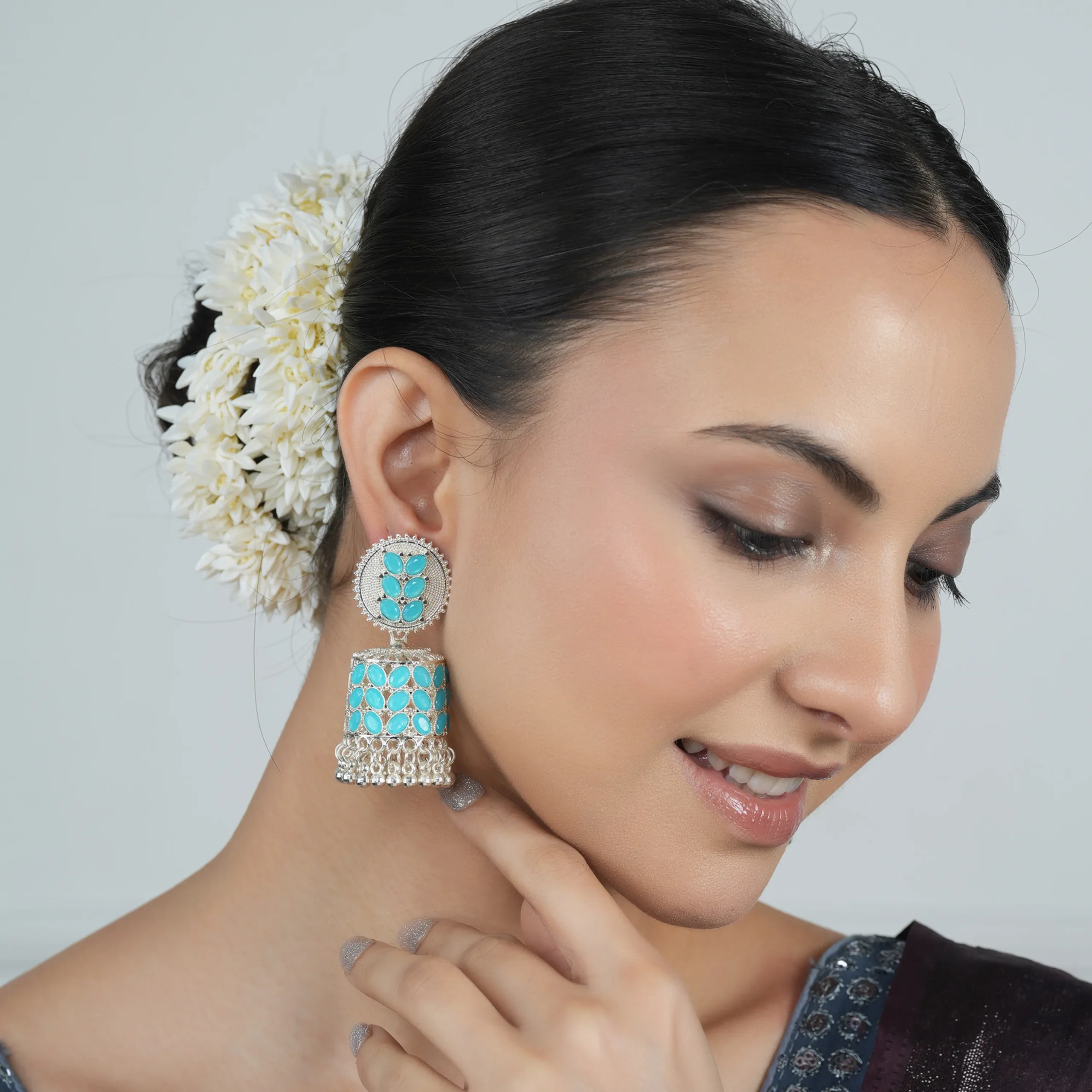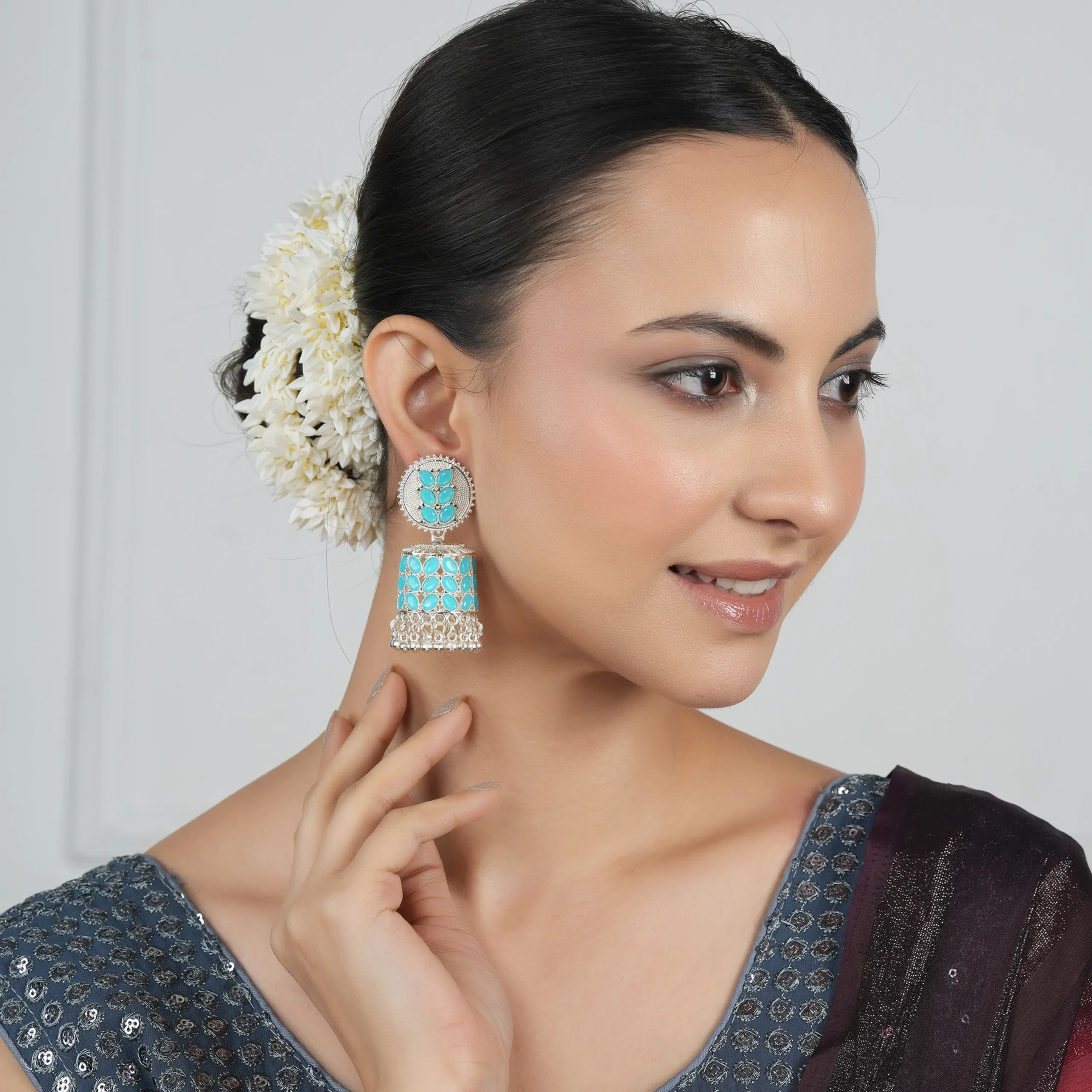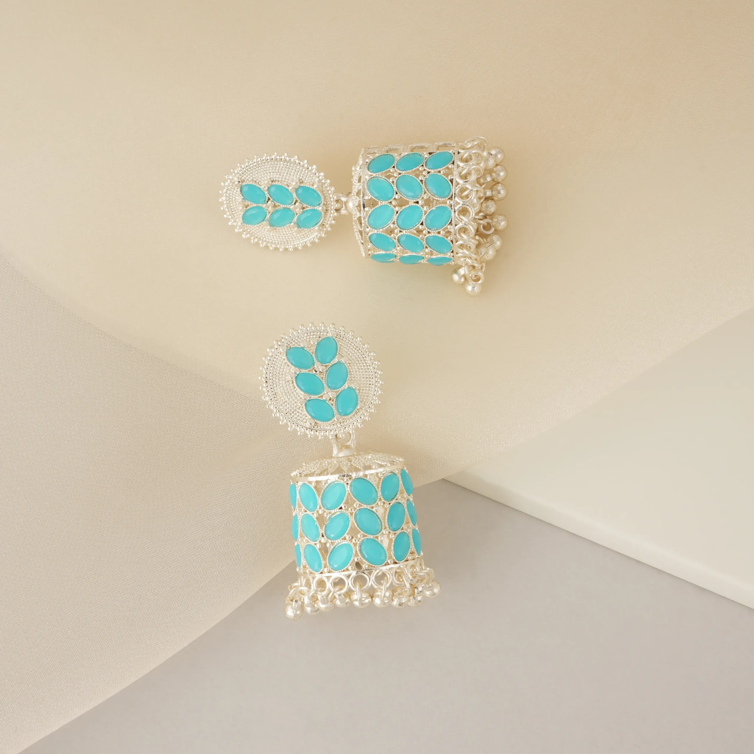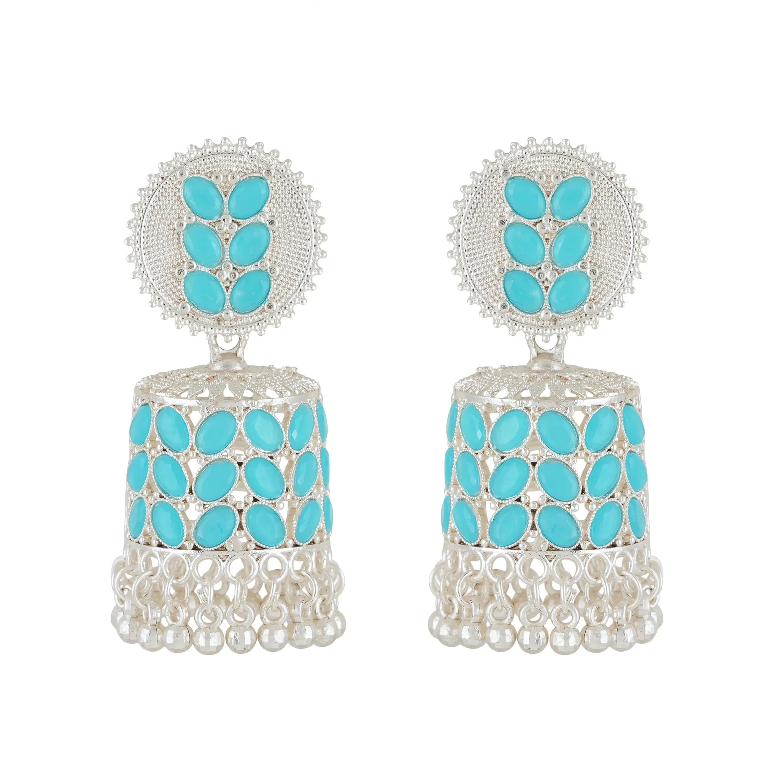 Embrace elegance with ikliv’s exquisitely handcrafted Turquoise Kundan Silver-Plated Jhumka Earrings, designed to complement your ethnic wardrobe with a blend of tradition and contemporary appeal. These statement earrings feature a detailed circular stud adorned with turquoise Kundan stones, leading to a grand dome-shaped jhumka encrusted with matching turquoise stones. The dangling silver beads at the base enhance the charm, adding a rhythmic sway with every movement.